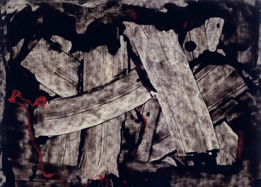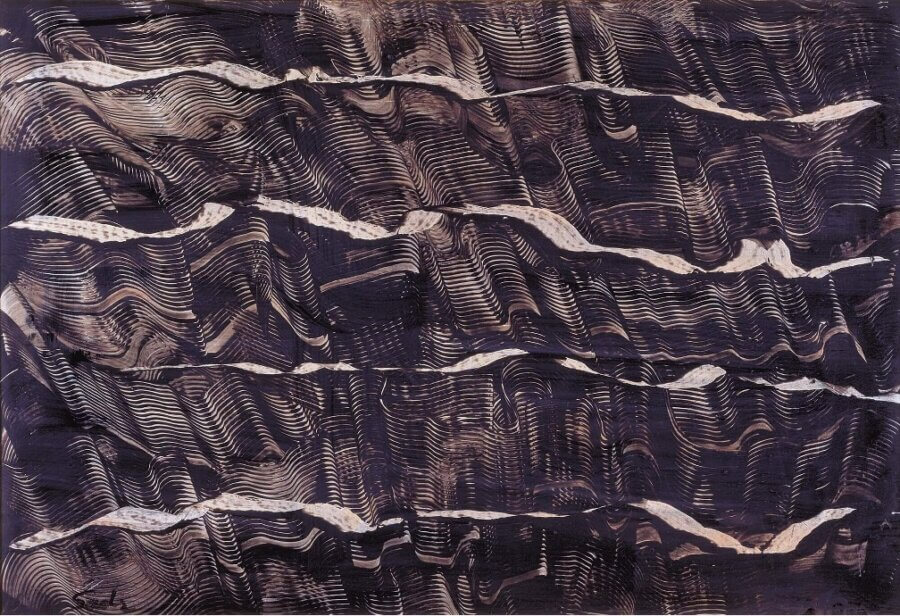 Over five decades of artistic practice, Sadr’s relation with nature—red, blue, green, and bleak nature, rendered and altered nature—threaded through various phases of her work, echoing her personal transformations during different stages of change in modern Iran and beyond. To Sadr, however, nature was not merely an isolated subject for representation; it was a realm to be experienced and perceived by the artist. This fascination with the substance of the world found expression in Sadr’s art amidst the weight and challenges of war, revolution, and migration. With black paint poured onto surfaces and knives and blades smeared in paint, Sadr made horizontal and vertical strokes in harmony with her body and awaited the slow drying of the created forms with elation: “I don’t always need light. The darkness of the dark is quite alluring, too.”[3]