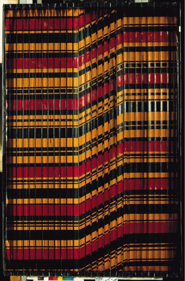 The 1960s was a prolific decade for Sadr. Based in Iran, she regularly participated in national and international biennials and exhibitions. Maintaining a critical distance from art practices that sought to respond to the formation of a national identity, she continued to favor a phenomenological approach over the application of vernacular iconography common at the time. In the first half of the decade, Sadr pursued action painting with a sustained aspiration to remove paint from the canvas and form strips out of negative spaces. Aligned with the rising pace and movement of modernization, she began making kinetic works in the later years of the decade, which were variations of abstract canvases under moving or fixed Venetian blinds. By the 1970s, Sadr’s work had mostly evolved into rhythmic yet disenchanted patterns on various surfaces, including aluminum, at times suggesting a viscous imagery of oil as the substance of modernity. Her unique approach visualized the dark chaos of extractive modernization and questioned the promises it could offer to Iranians at midcentury. Later in her career, as illness began to affect her body and exile shifted her perspective, Sadr transitioned from predominantly working on large-scale paintings to creating smaller photomontages in the 1980s. Despite these changes, Sadr’s profound appreciation for painting as a means of personal expression remained at the core of her practice. Notably, her collages integrate her distinctive mark-making as internal components or within the framing boundaries of the works.